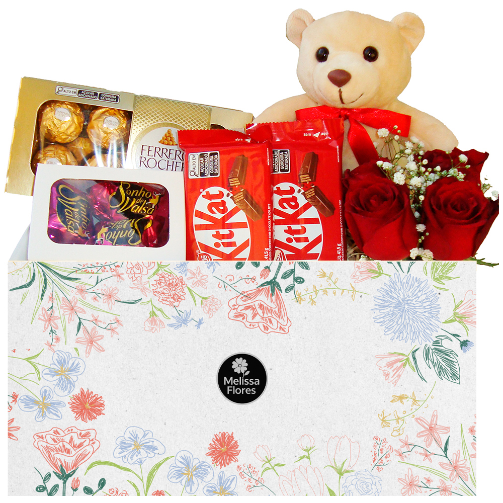 01 Pelúcia , 03 Sonho de Valsa, 1 Ferrero Rocher 8 unidades , 02 KitKat, 04 Rosas Vermelhas , Kit acompanha caixa branca presenteável.